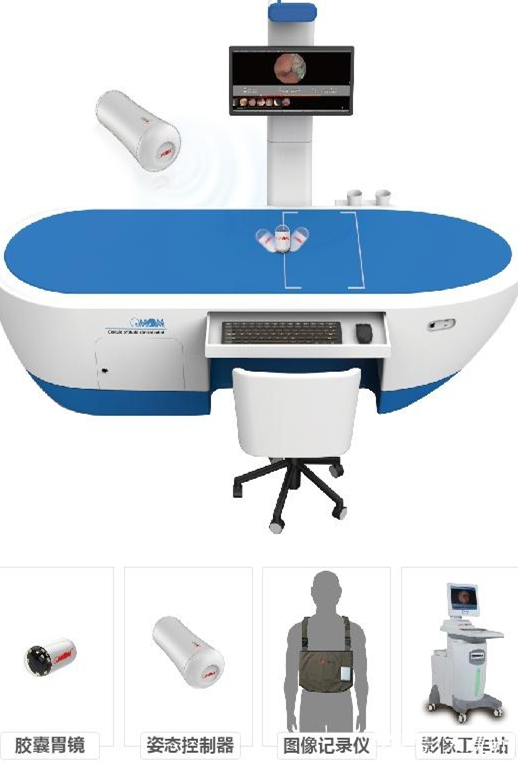 膠囊胃鏡系統由膠囊式內窺鏡、手持式姿態控制器、圖像記錄儀、影像工作站(分為臺式、床式與便攜式)四部分組成。